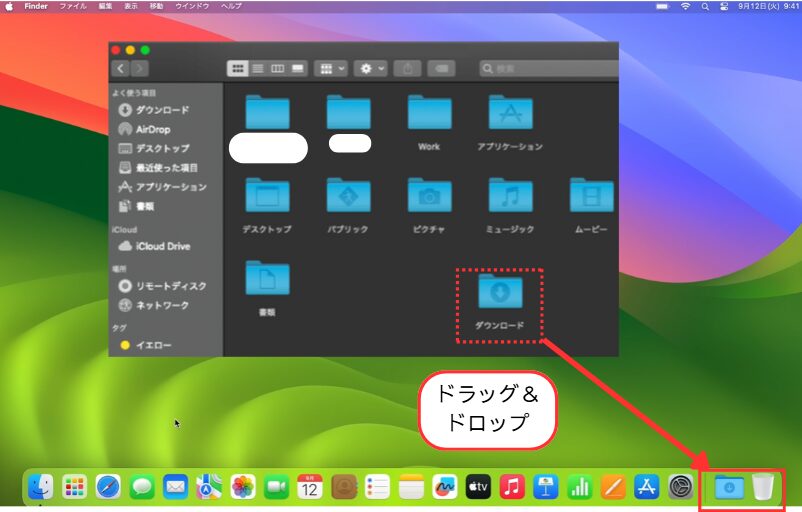 ダウンロードフォルダをドラッグアンドドロップで右下のDock部分に持ってくれば、再びダウンロードフォルダがデスクトップからアクセスできるようになります。