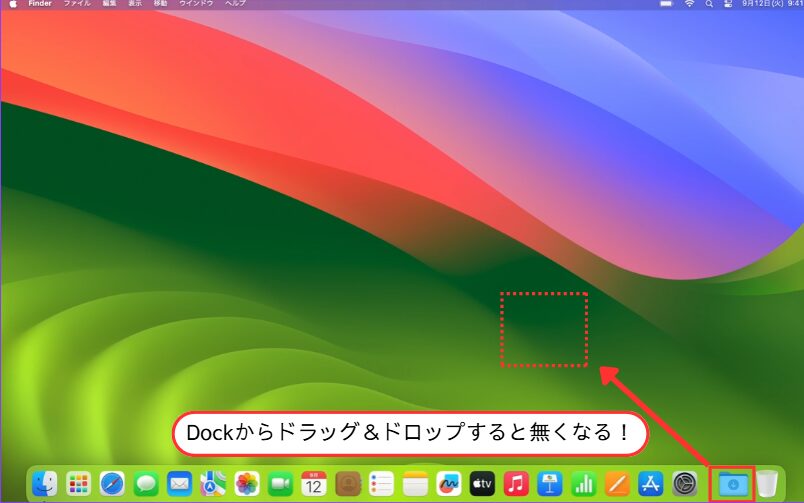実はDockにあるダウンロードフォルダは、DockからデスクトップにドラッグアンドドロップしてしまうとDockから消えてしまうんです。
