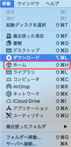 すると以下の画像のように移動できるフォルダの一覧が出てくるので、「ホーム」をクリックします。