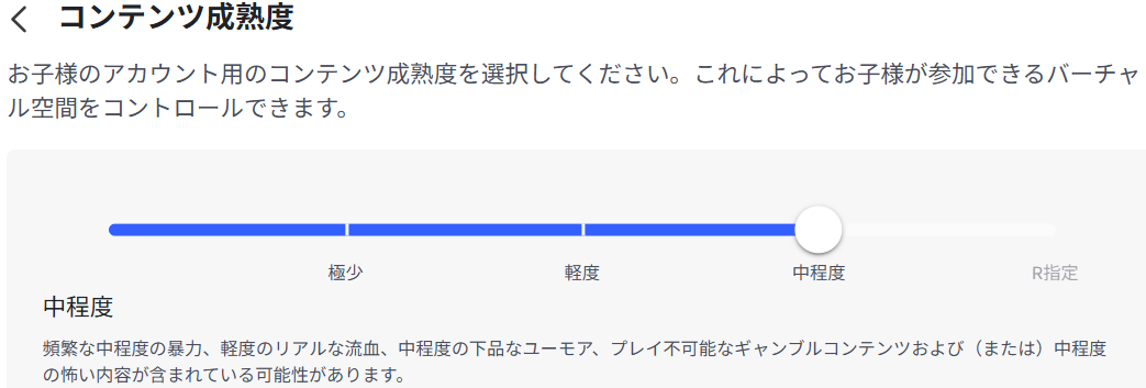 先ほどの「ゲーム内容の年齢制限」の章にあった「コンテンツ成熟度」を設定することも重要。