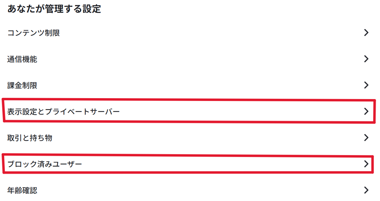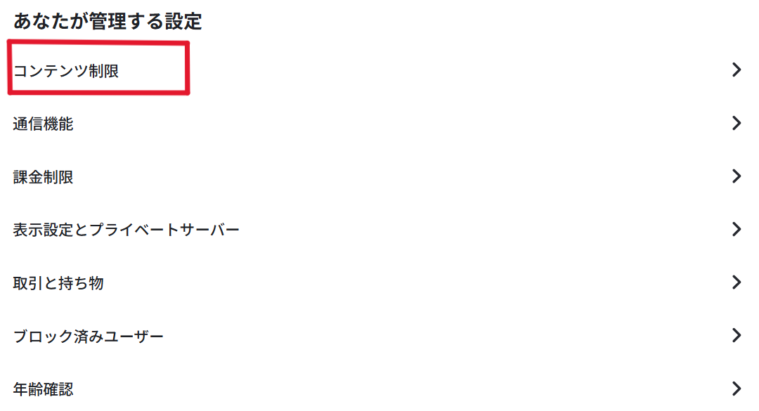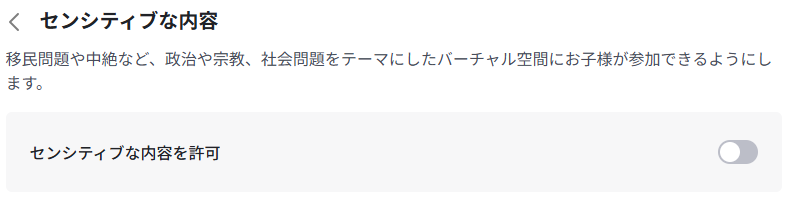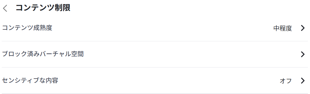 5. この画面から「コンテンツ成熟度」「ブロック済みバーチャル空間」「センシティブな内容」といった設定が行えます