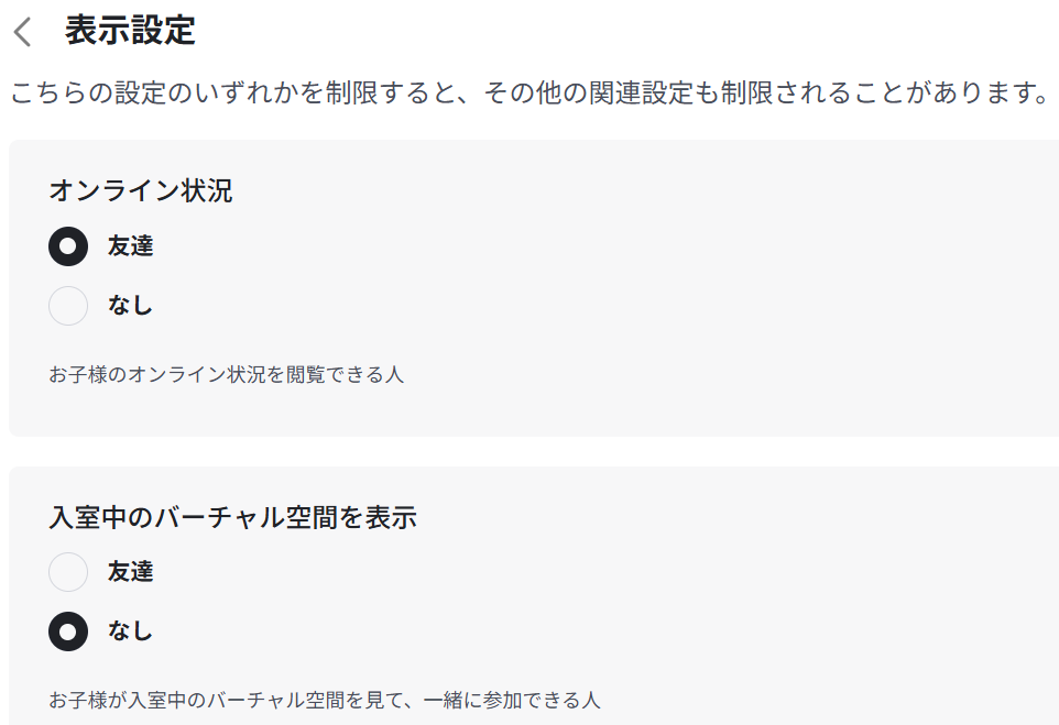 「表示設定とプライベートサーバー」からは、お子さんのオンライン状況が他人から見えるかどうかなどを設定できます。
