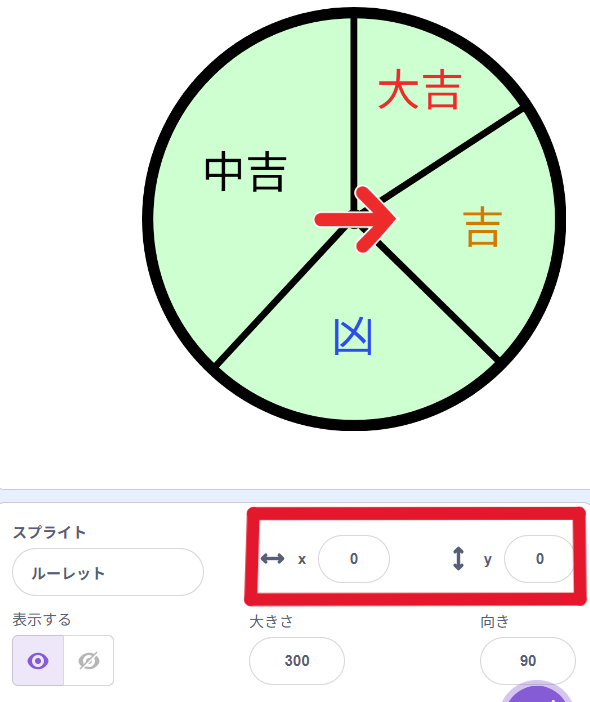 位置いち(x, y)」はルーレットと矢印やじるしのどちらも、xとyを0にしておくとなかからずれないよ!