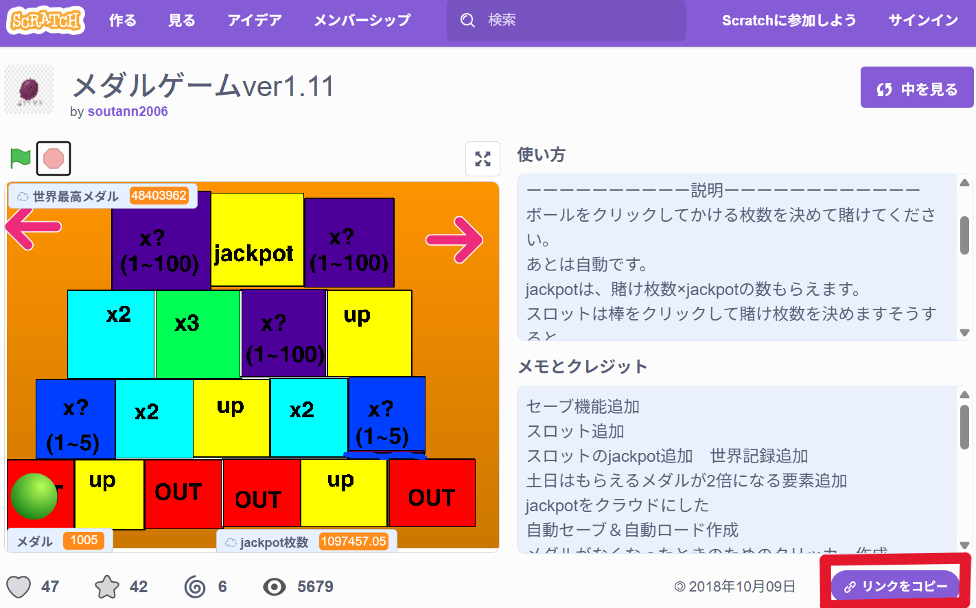 じつは、プログラミングサイトの「スクラッチ(Scratch)」には、ゲーセン顔けのクオリティでつくられた「メダルゲーム」がたくさんあるんだ!