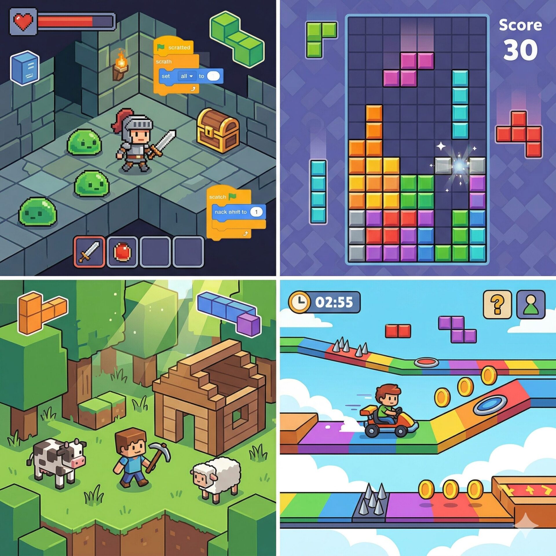 スクラッチなら、ロブロックスで遊んでいるような大人気ゲーム風の作品を、ブロックを組み合わせるだけで簡単に自作できます!