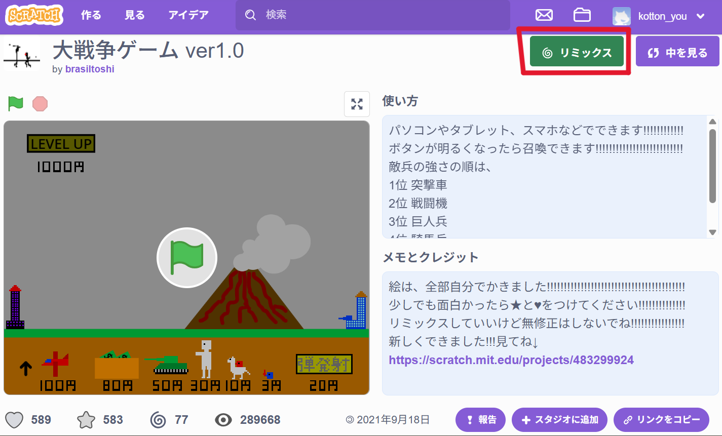 - リミックスしたい作品を見つけたら「リミックス」ボタンをクリック