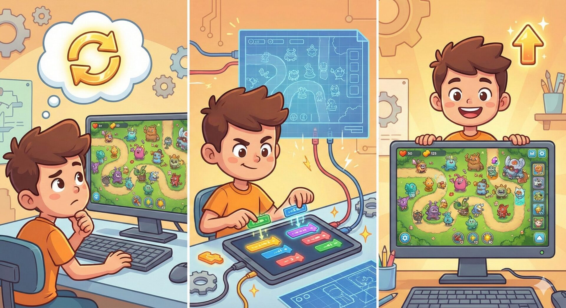 難しそうに見えるけど、この記事の通りにブロックを並べるだけで、自分だけのゲームが作れちゃうんだ。